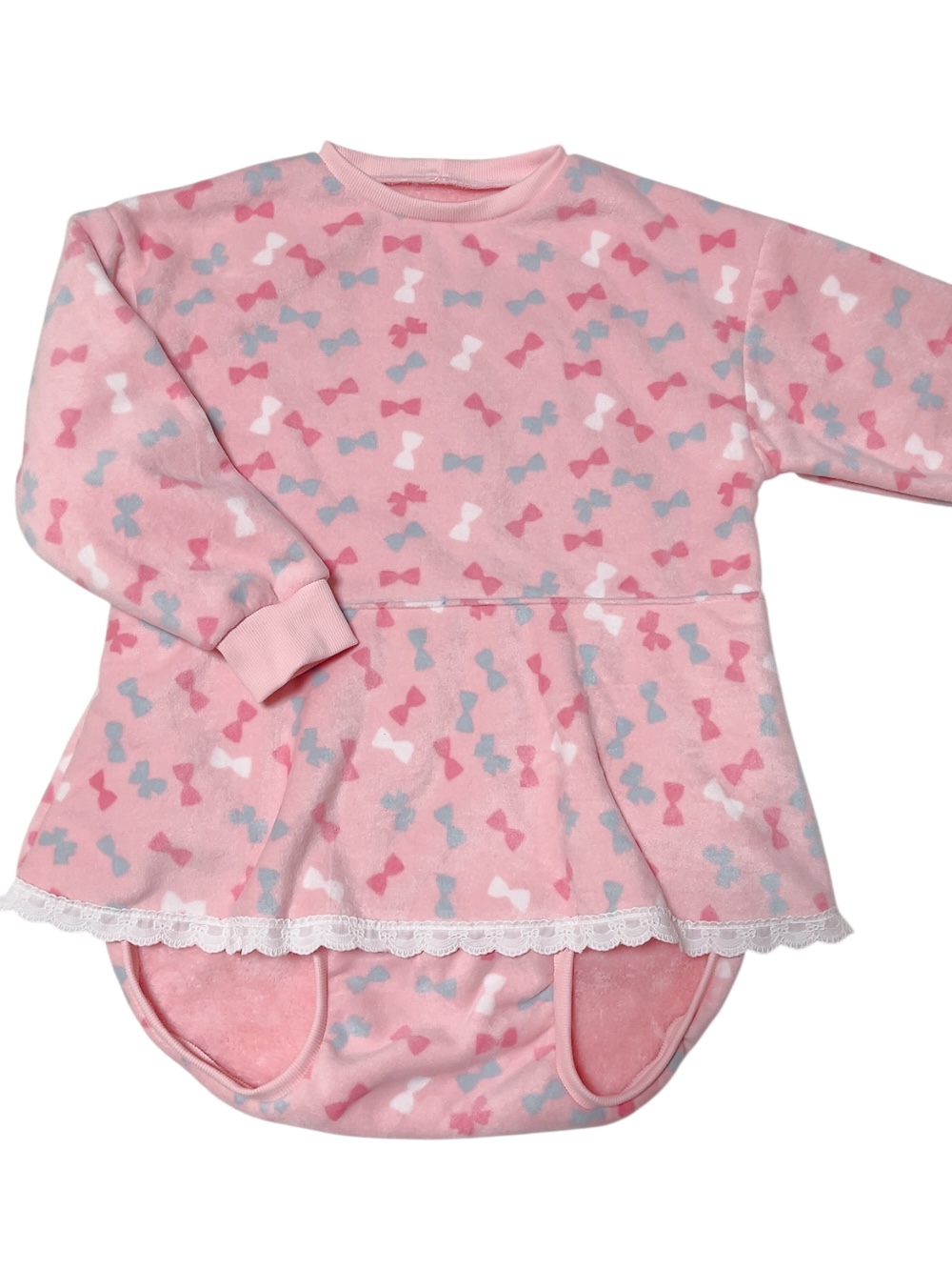 大人用 スカート付きロンパースリボン柄ふんわりあったか長袖